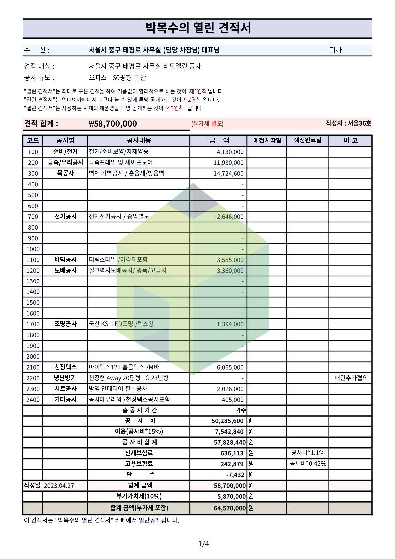 사무실인테리어 견적서 및 비용