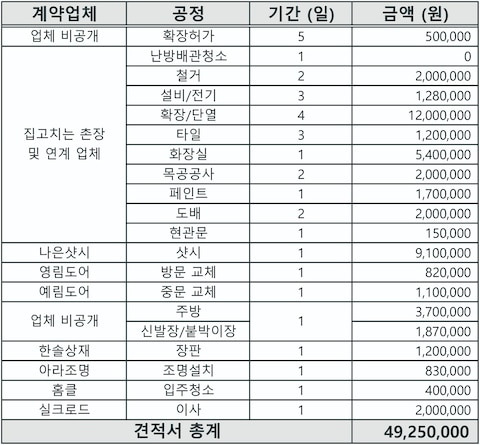 맘대로 신혼집 리모델링 1화에서 공사별 공사범위를 확실히 정했다면 그에 맞는 업체를 찾아야겠죠? 이번에는 공정별 업체선택 방법부터 견적서까지 최대한 자세히 소개해드릴게요! (※스